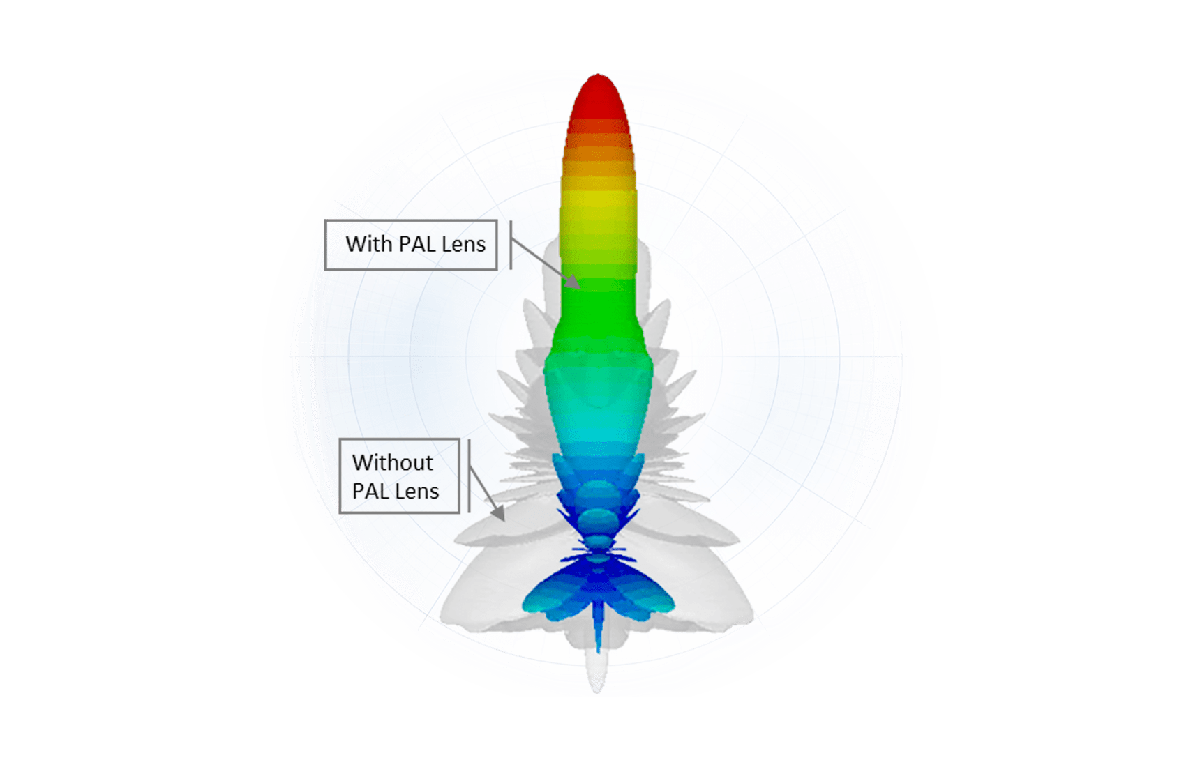 This representative comparison illustrates the enhanced energy concentration achieved with PAL. By reducing spill-over and illumination losses, PAL reshapes the radiation pattern to deliver higher directivity, improved gain, and more efficient use of transmitted power.