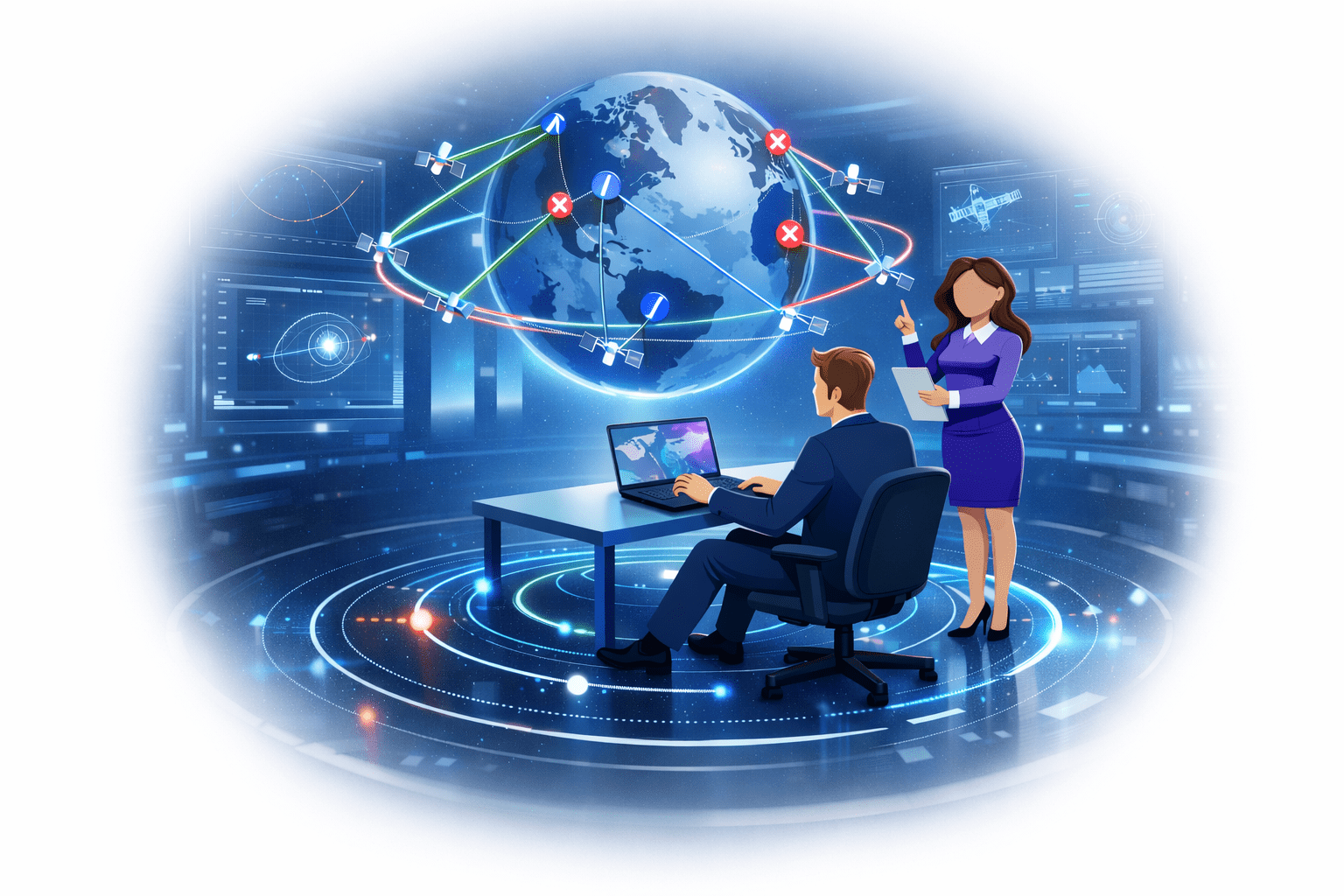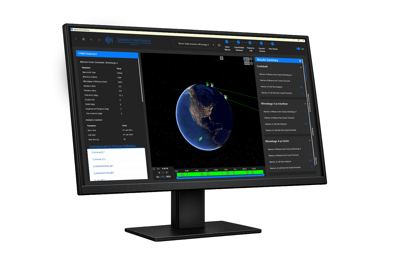 Observe satellite orbits for missions under evaluation and see exactly when interference occurs, where it occurs, and who it involves during a simulation. Identify mission operating hazards and who to coordinate with at a glance to avoid interference collisions.